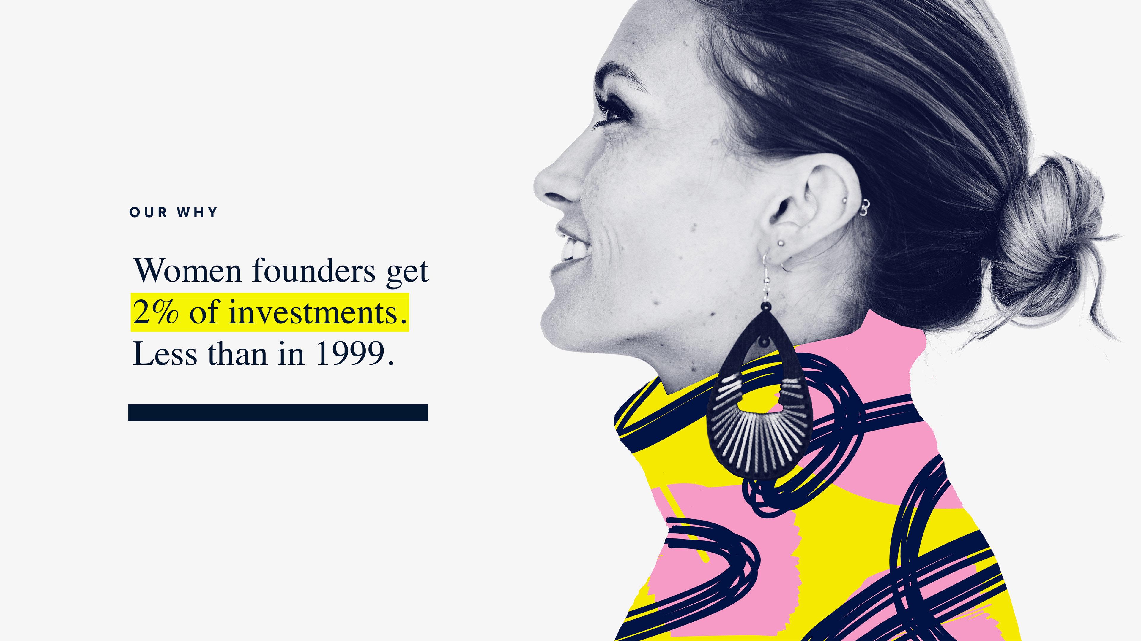 In a society where women founders receive 2% of investments, and founders of color receive less than 1% of venture funding, the branding had to be disruptive and exacting to get the point across about the pattern blindness surrounding investment and funding.